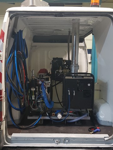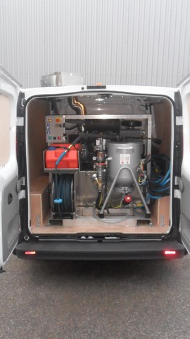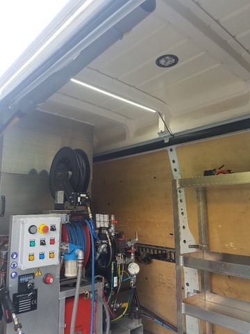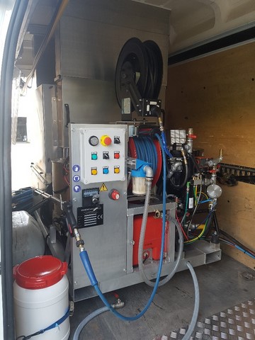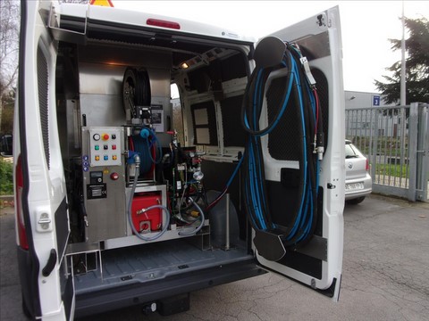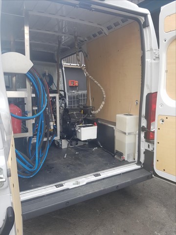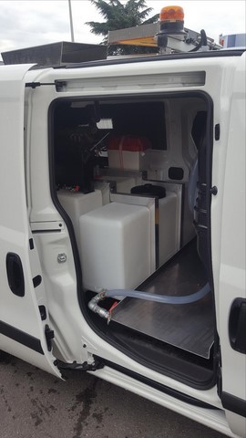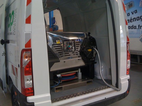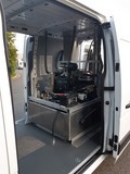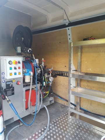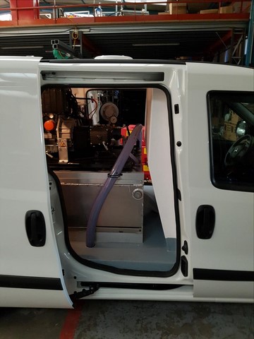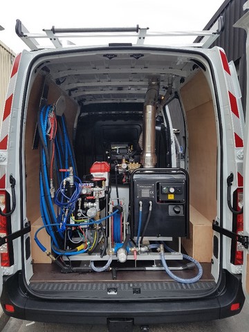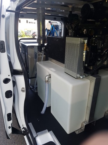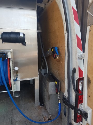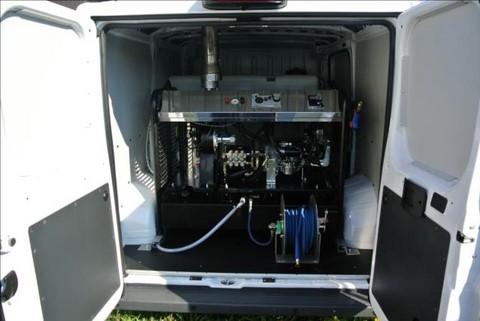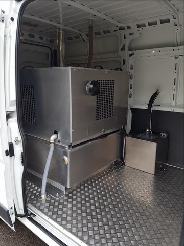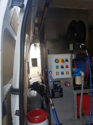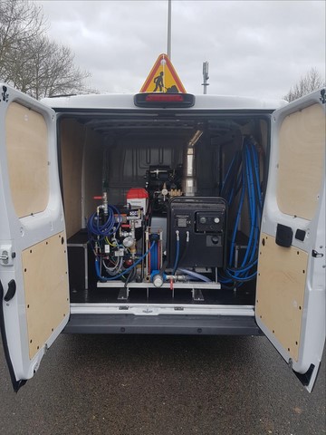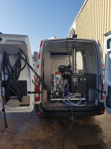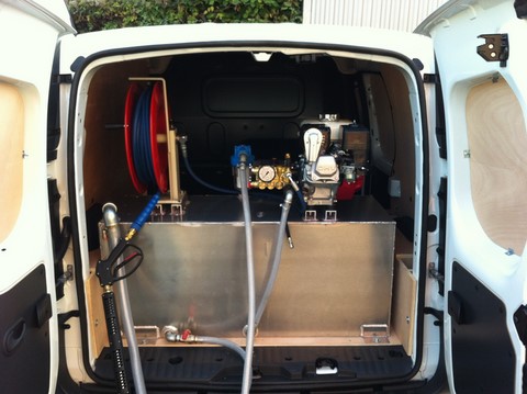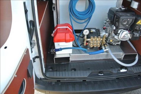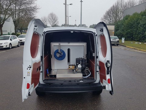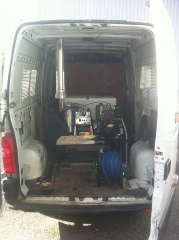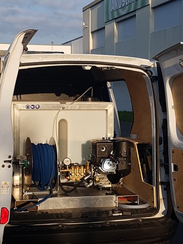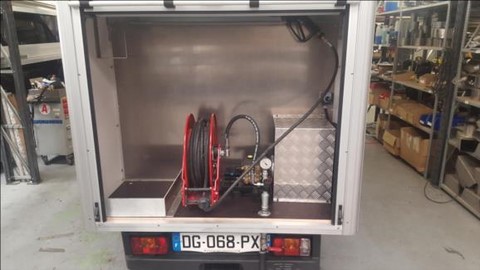 Livraison d'un nettoyeur haute pression eau chaude et aménagement complet d'un petit atelier dans véhicule utilitaire.
