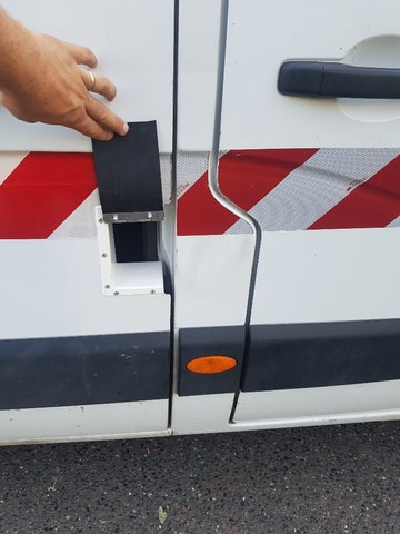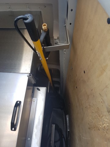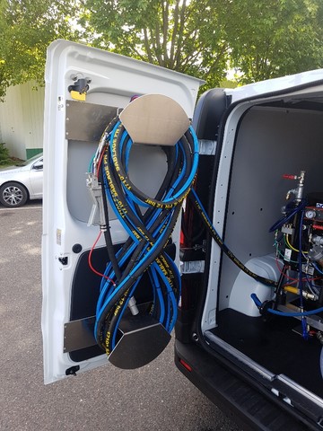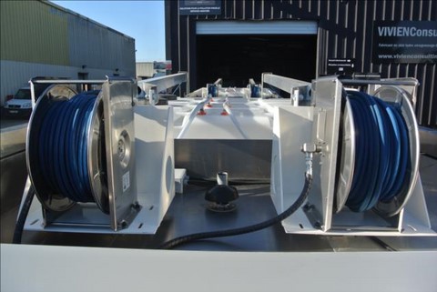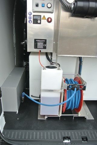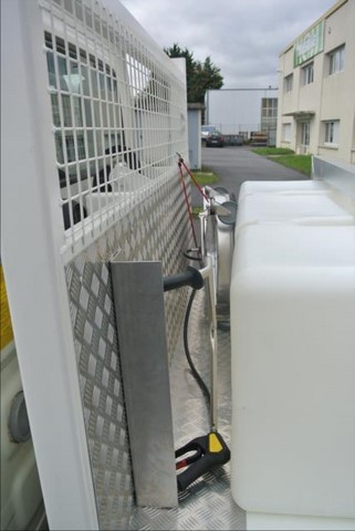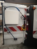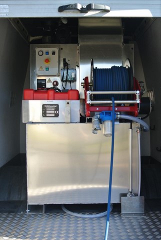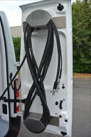 Porte tuyau inox fixé sur la porte arrière du véhicule avec 20 mètres de tuyau hydrogommage