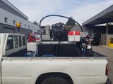Livraison et formation d'une aérogommeuse fixe en acier 18 litres sur roues et compresseur 18cv avec aéroréfrigérant dans châssis aluminium. Ces éléments sont installés dans un Pick up de la ville.